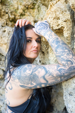 Heavily Tattooed Plus Sized Female Model On South Shields Beach She Is Stood Against The Rocks Her Tattoo Sleeved Arm On Show Stock Foto Adobe Stock